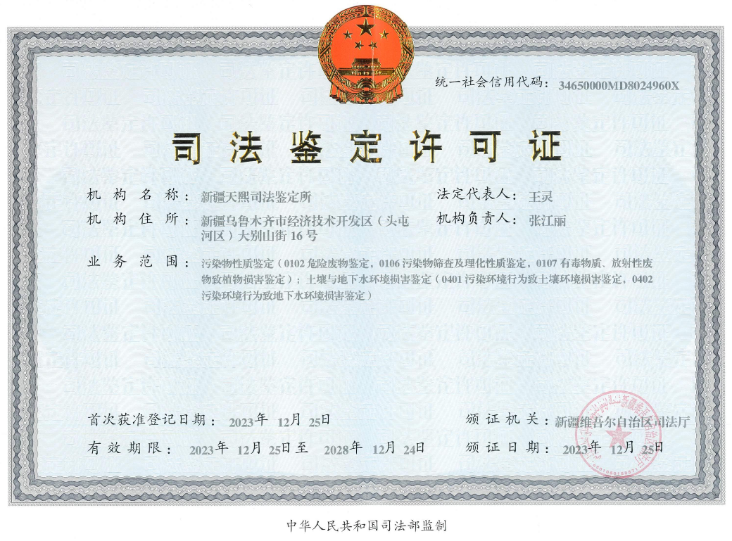 2023年12月通過新疆維吾爾自治區司法廳組織的司法鑒定人執業培訓考核和機構評審,取得了司法鑒定許可證。可開展污染物性質鑒定、土壤與地下水環境損害鑒定業務。