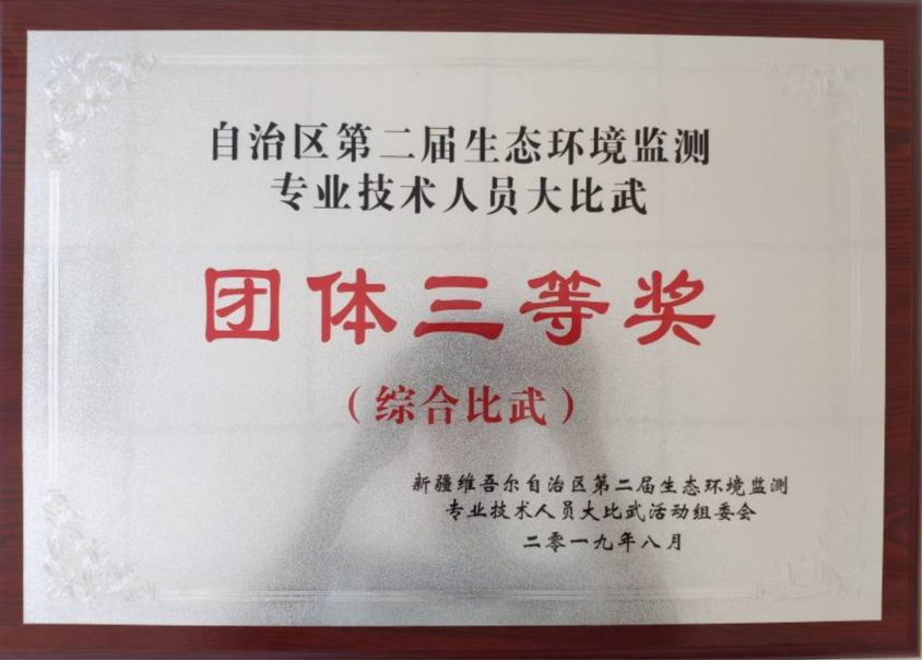 2019年8月,在新疆維吾爾自治區(qū)第二屆生態(tài)環(huán)境監(jiān)測(cè)專業(yè)技術(shù)人員大比武中取得了團(tuán)體三等獎(jiǎng)(第四名,第三方環(huán)境檢測(cè)機(jī)構(gòu)第一名):